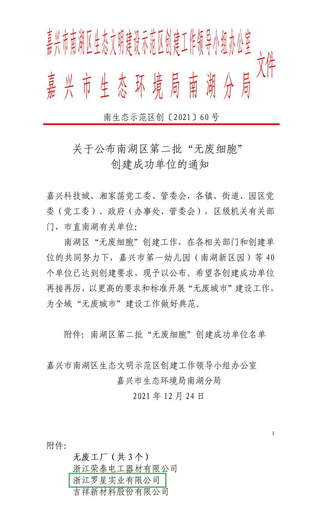 日前,嘉興市南湖區公布了第二批“無廢細胞”創建成功單位,我司成功上榜!