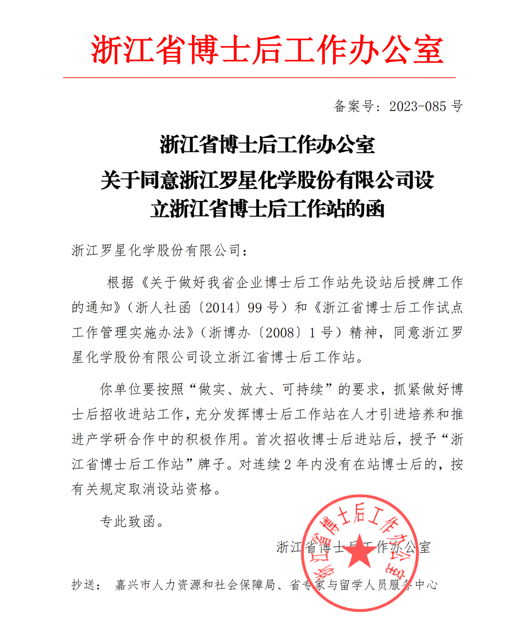 近日,公司收到浙江省博士后工作辦公室下發的《浙江省博士后工作辦公室關于同意浙江羅星化學股份有限公司設立浙江省博士后工作站的函》,公司獲批設立浙江省博士后工作站!